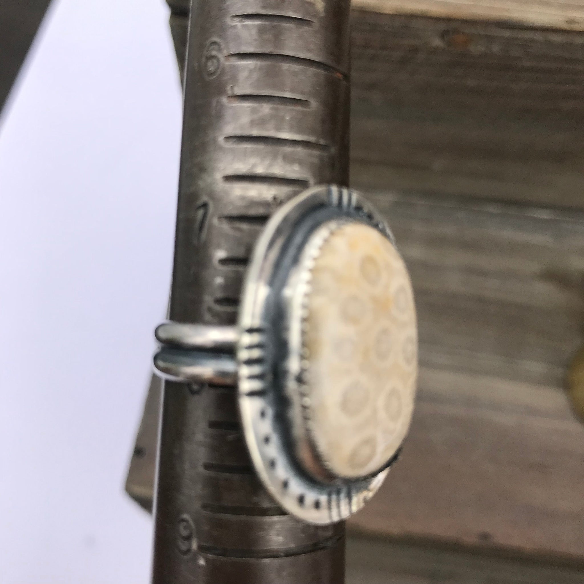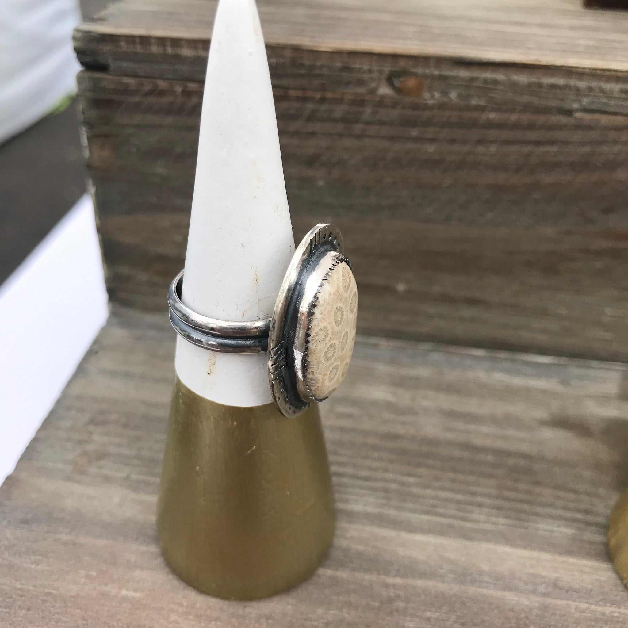 This beauty is a true statement piece. Measuring 1” tall x .75” wide. Size 8 Sterling. If you would like a different size please contact us.